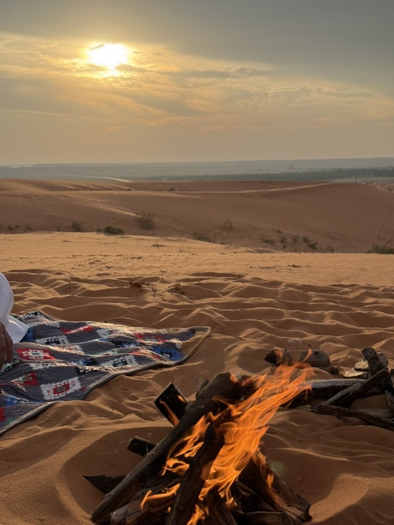 We spent the evening tucked between Ushaiqer’s dunes, the air cooling as the sun slipped away. Abu Abdulaziz filled the silence with old stories, then began reciting poetry, verses about family, history, and heritage, and the feeling of returning to where you began, as if every road eventually bends back to its origin.